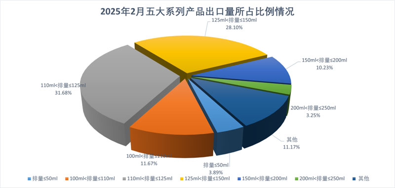 2月,出口量位居前六位的系列品種為:125系列(110ml<排量≤125ml)、150系列(125ml<排量≤150ml)、110系列(100ml<排量≤110ml)、200系列(150ml<排量≤200ml)、50系列(排量≤50ml)和250系列(200ml<排量≤250ml),分別出口25.53萬輛、19.34萬輛、8.66萬輛、8.08萬輛、2.7萬輛、2.53萬輛。與去年同期相比,125系列增長56.63%,150系列增長24.28%,110系列增長33.52%,200系列同比增長58.05%,50系列增長20.05%,250系列增長12.14%。