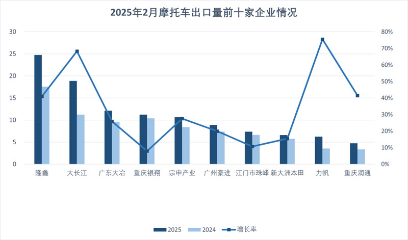 1-2月,摩托車出口量排名前十位的企業依次為:隆鑫、大長江、廣東大冶、重慶銀翔、宗申、廣州豪進、江門市珠峰、新大洲本田、力帆、重慶潤通,上述十家企業共出口111.42萬輛,占摩托車出口總量的61.67%。
