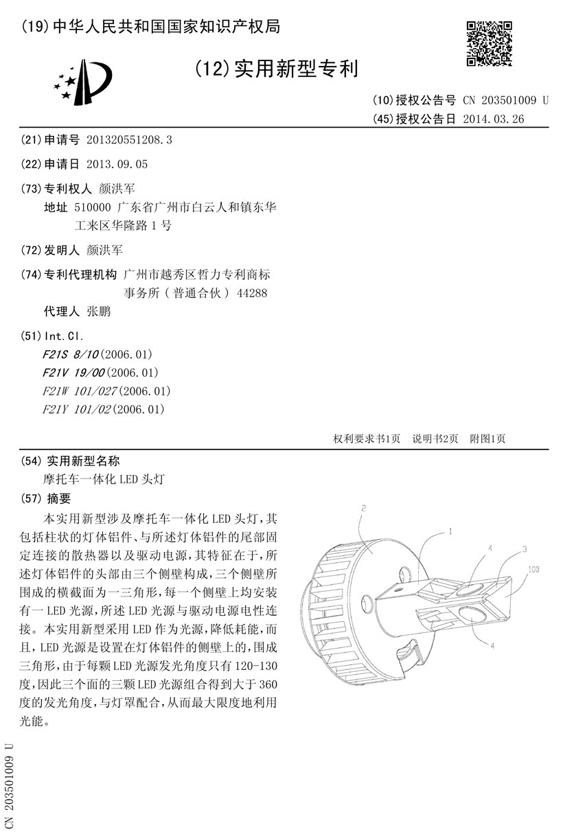 簡要說明: 本實用新型涉及摩托車一體化LED頭燈,其包括柱狀的燈體鋁件、與所述燈體鋁件的尾部固定連接的散熱器以及驅動電源,其特征在于,所述燈體鋁件的頭部由三個側壁構成,三個側壁所圍成的橫截面為一三角形,每一個側壁上均安裝有一LED光源,所述LED光源與驅動電源電性連接。本實用新型采用LED作為光源,降低耗能,而且,LED光源是設置在燈體鋁件的側壁上的,圍成三角形,由于每顆LED光源發光角度只有120-130度,因此三個面的三顆LED光源組合得到大于360度的發光角度,與燈罩配合,從而最大限度地利用光能。 |