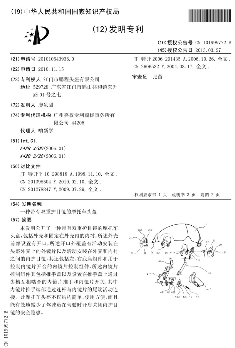 | 專利名稱:一種帶有雙重護目鏡的摩托車頭盔 專利類型:發明專利 申請號:2010105439360 申請日:2010.11.15 公告號:CN101999772B 公告日:2013.03.27 專利權人:江門市鵬程頭盔有限公司 發明(設計)人:廖汝甜 地址:529728廣東省江門市鶴山共和鎮東升路01號之七 分類號:A42B3/00(2006.01)I; A42B3/22(2006.01)I 代理機構:廣州嘉權專利商標事務所有限公司44205 代理人:喻新學 收費信息:點擊查詢 |