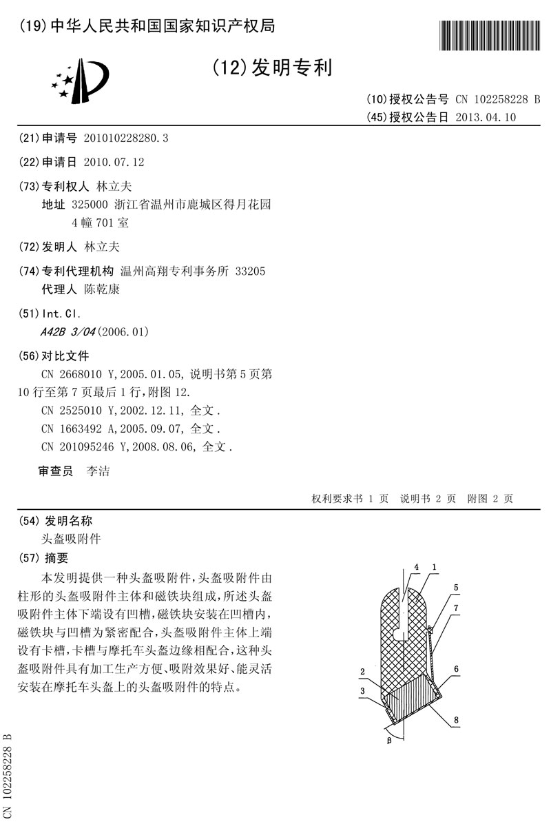 簡要說明:本發明提供一種頭盔吸附件,頭盔吸附件由柱形的頭盔吸附件主體和磁鐵 塊組成,所述頭盔吸附件主體下端設有凹槽,磁鐵塊安裝在凹槽內,磁鐵塊與 凹槽為緊密配合,頭盔吸附件主體上端設有卡槽,卡槽與摩托車頭盔邊緣相配 合,這種頭盔吸附件具有加工生產方便、吸附效果好、能靈活安裝在摩托車頭 盔上的頭盔吸附件的特點。 |